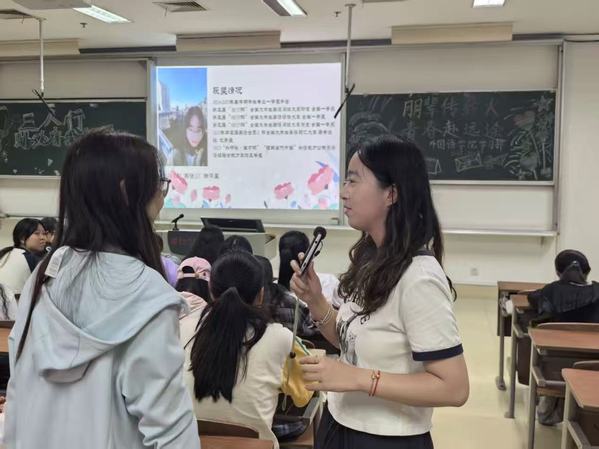伴着暖场灯光,外国语学院辅导员陆明明率先走上讲台,以温柔而亲切的语调与大一新生展开交流,她鼓励大家珍惜与优秀学长学姐面对面交流的机会,在交流分享中找到属于自己的“成长关键词”,为大学生涯筑牢根基。
