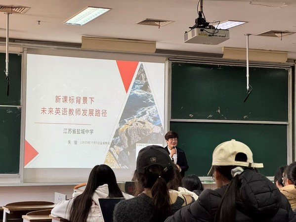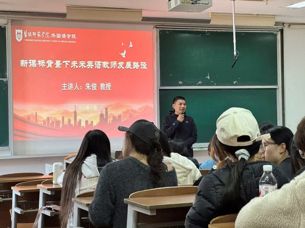 为助力英语师范生明确职业发展方向,提升专业素养与就业竞争力,2025年11月5日,盐城师范学院外国语学院特邀江苏省盐城中学朱俊教授对我院2023级所有英语师范生开展“新课标背景下未来英语教师发展路径”专题讲座。