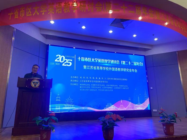 2025年11月15日至16日,第二十二届十省、市、区大学英语教学研讨会暨江苏省高等学校外国语教学研究会年会在东南大学召开。来自福建、贵州、海南等十个省市自治区的高校外语教师逾200人参会,围绕“人工智能时代的大学外语教学改革与发展”展开研讨。江苏省高等学校外国语教学研究会会长、东南大学李霄翔教授主持开幕式并致辞,强调外语教育需积极适应技术变革,推动教学模式创新。我院大外部主任朱洪祥老师参会,并应邀在平行分会场做交流发言。