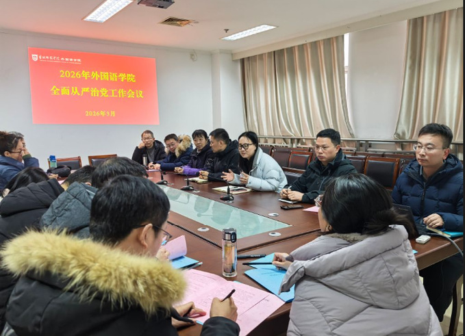 3月19日下午,外国语学院在通榆校区教学主楼13楼东会议室召开全面从严治党工作会议。学院领导班子、系(部)主任、科级干部及各党支部书记参加会议,会议由学院党委书记张宾州主持。
