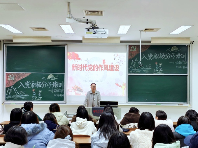 为引导入党积极分子铸牢信仰之魂、坚定理想信念,11月26日下午,外国语学院在主楼B208教室开展秋学期入党积极分子党课培训暨培训班总结会。本次党课由外国语学院党委书记张宾州主讲,2025年秋季学期入党积极分子全体参加。